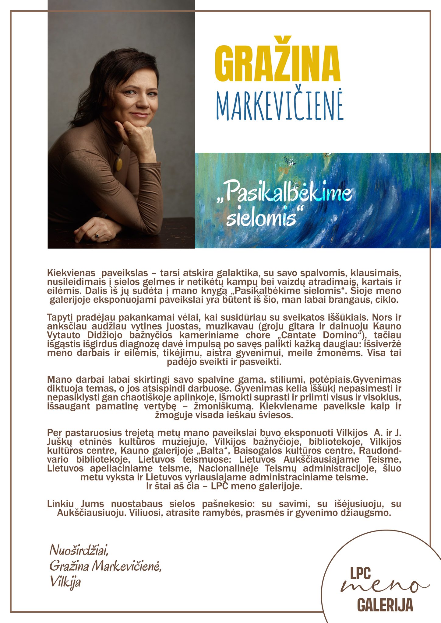 LPC meno galerijoje atidaryta menininkės Gražinos Markevičienės tapybos darbų paroda „Pasikalbėkime sielomis“.